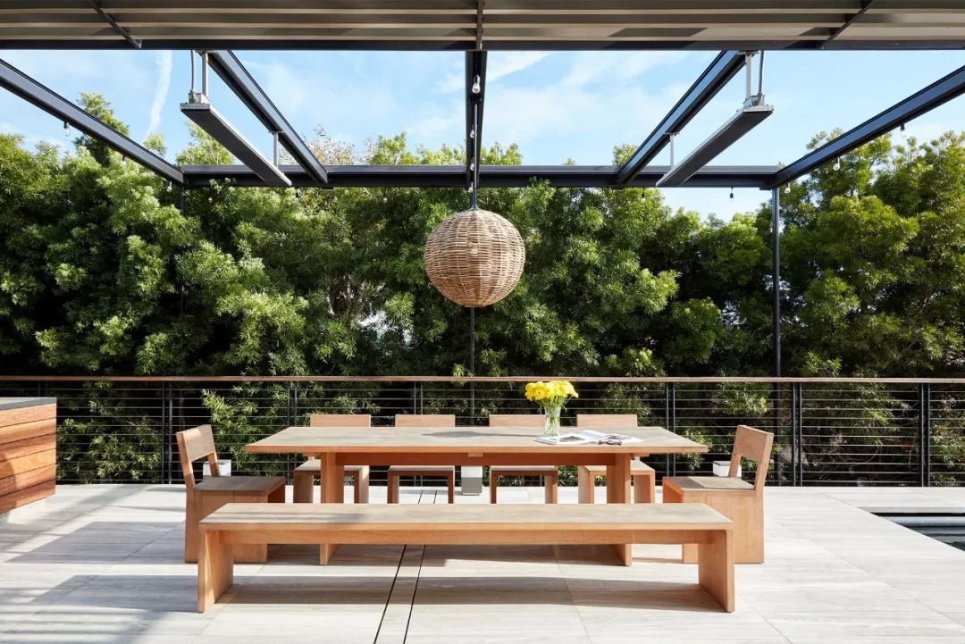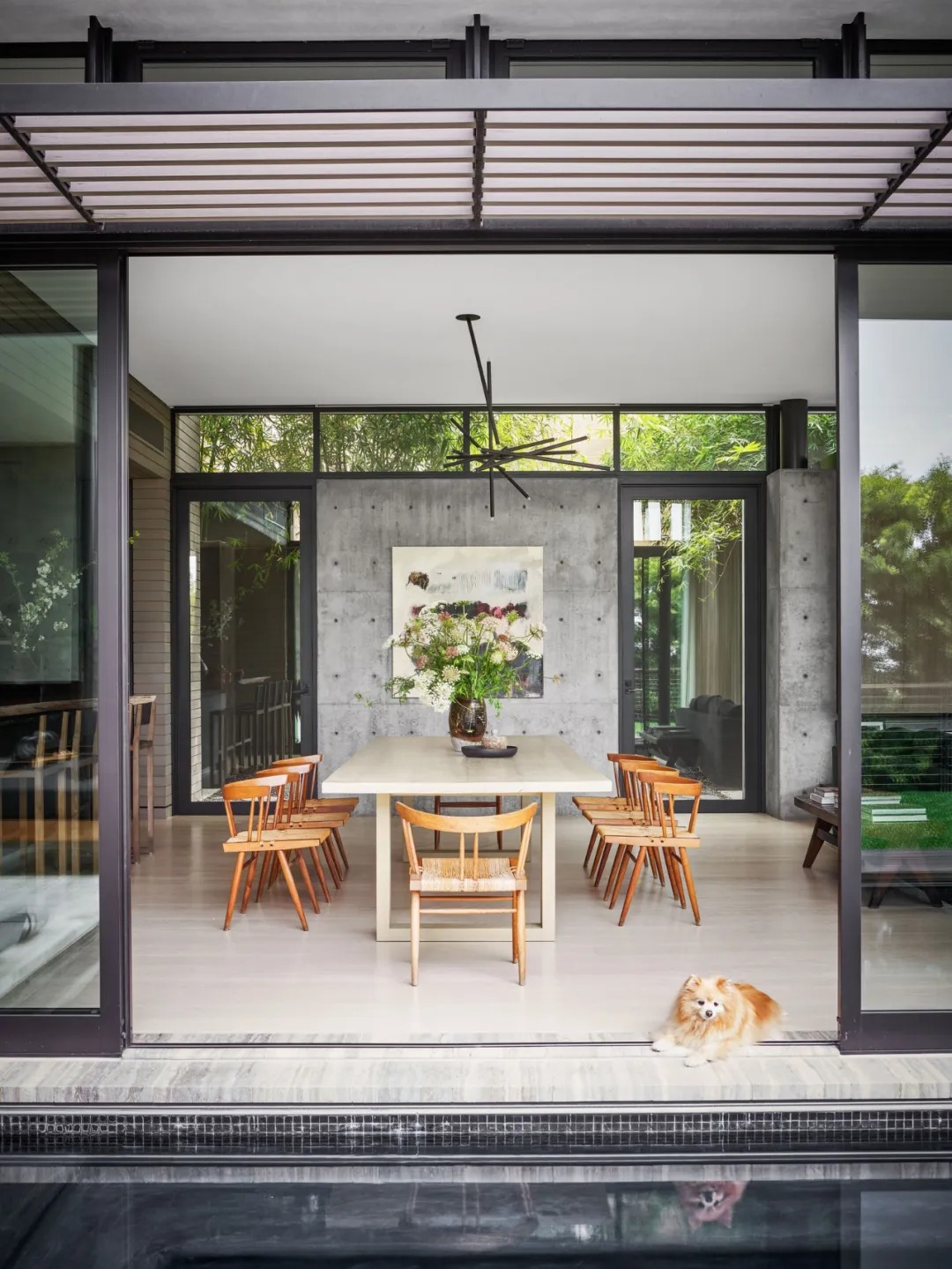 房子有大面積的落地窗,客廳早晨會有泳池里的波光灑進(jìn)室內(nèi),與焦糖色的木色調(diào),讓身處在屋子里的人,倍感溫馨舒暢。