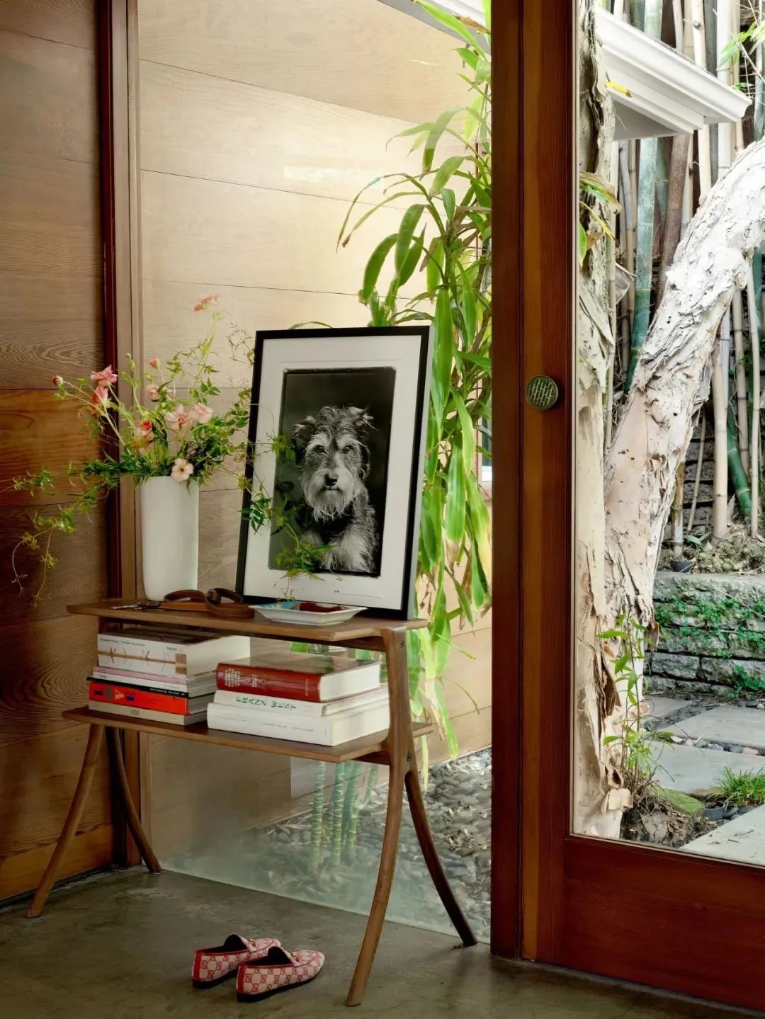 院墻內(nèi)一景,是日式枯山水的樣貌,墻外綠蔭蔭的綠葉都忍不住探過頭來偷窺。作為愛狗人士的張靜初,狗狗當(dāng)然是家里重要的家庭成員。