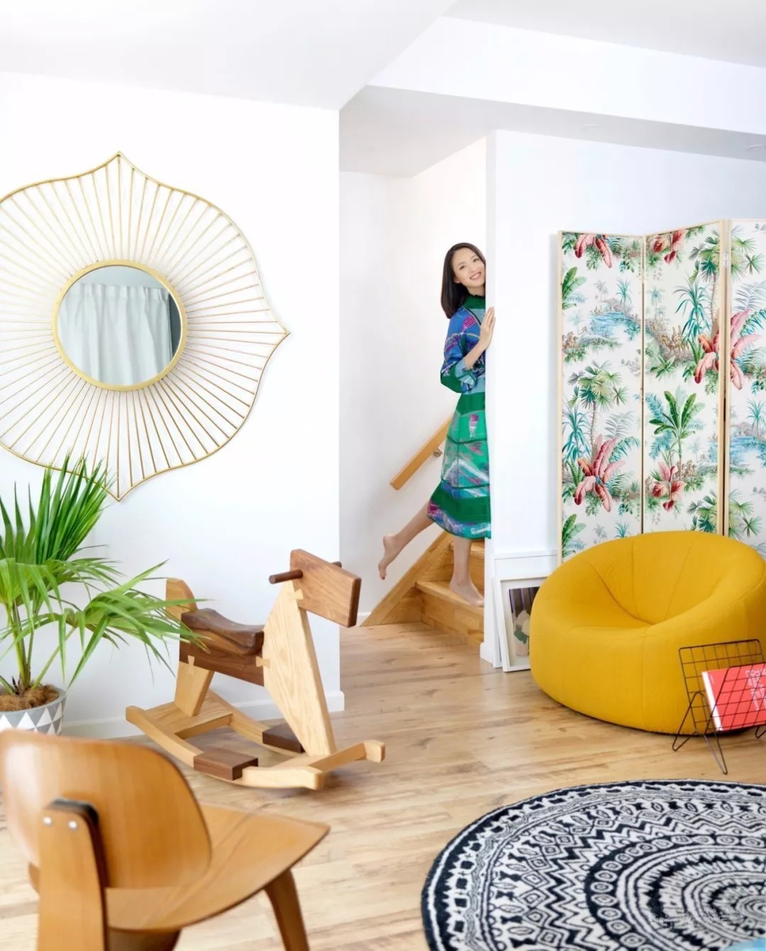 從進(jìn)門的第一眼就讓人很舒服,玄關(guān)處擺放著電影院式的沙發(fā)座椅,旁邊斜斜的躺著她在維也納拍戲時(shí)淘來的雨傘。