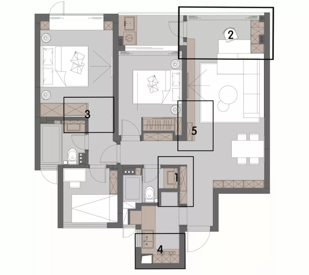 3、主臥利用衣柜設(shè)計(jì)增加嵌入式移門(mén),平時(shí)可隱藏變成套房形式;