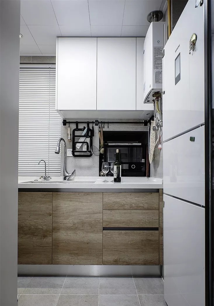 白色操作臺(tái)讓廚房色彩過(guò)渡自然,利用衛(wèi)生間飄窗位置放置微波爐,充分利用空間提高了廚房的實(shí)用功能。