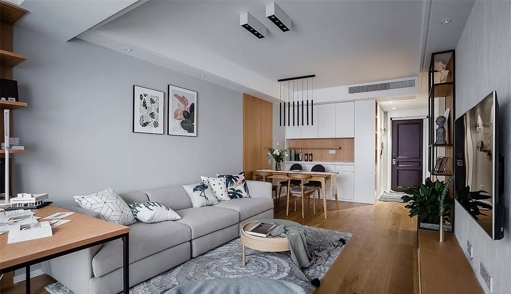 全屋通鋪木地板,墻面刷淺灰色漆,將原木搭配灰色的美感發(fā)揮到極致,營(yíng)造一個(gè)放松身心的空間。客廳軟裝和硬裝的結(jié)合,打造出簡(jiǎn)約大氣的氛圍,溫柔而有力量。