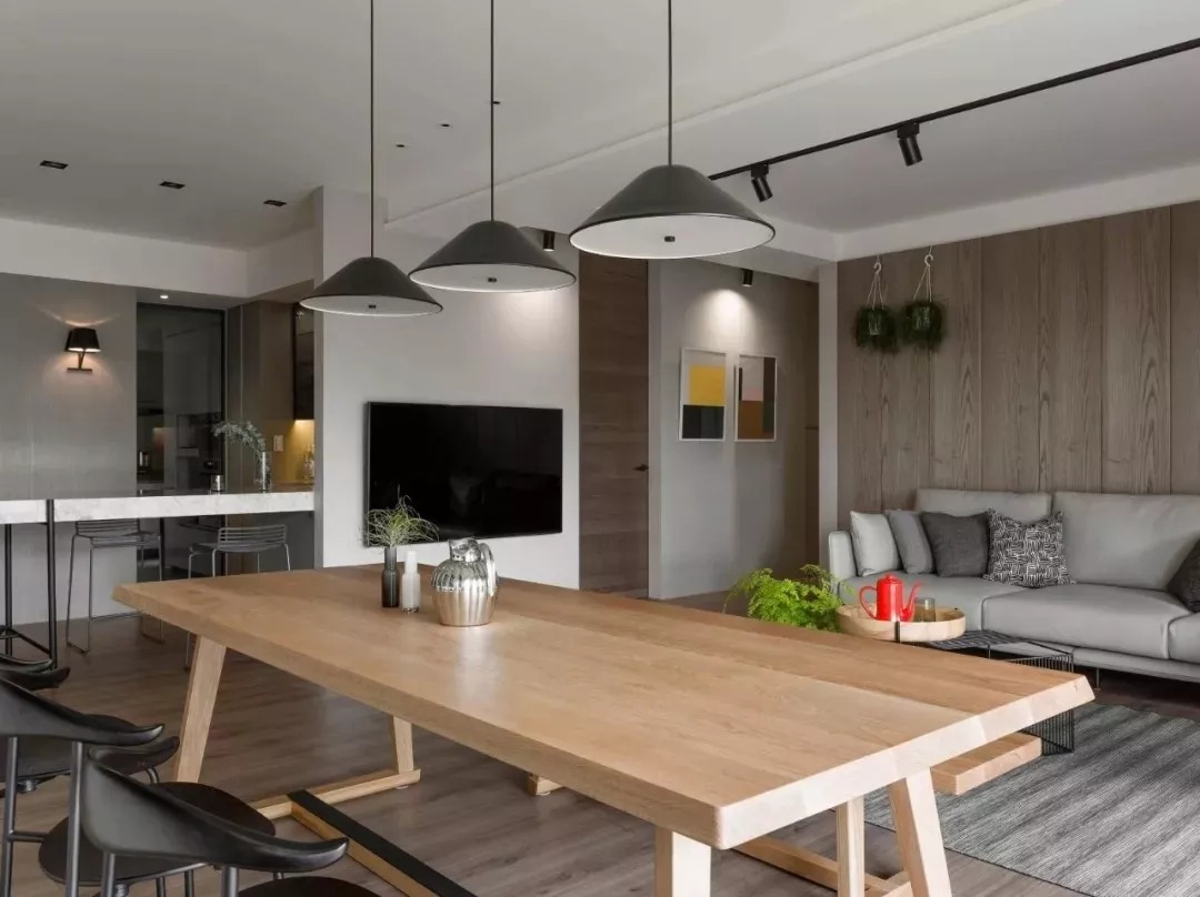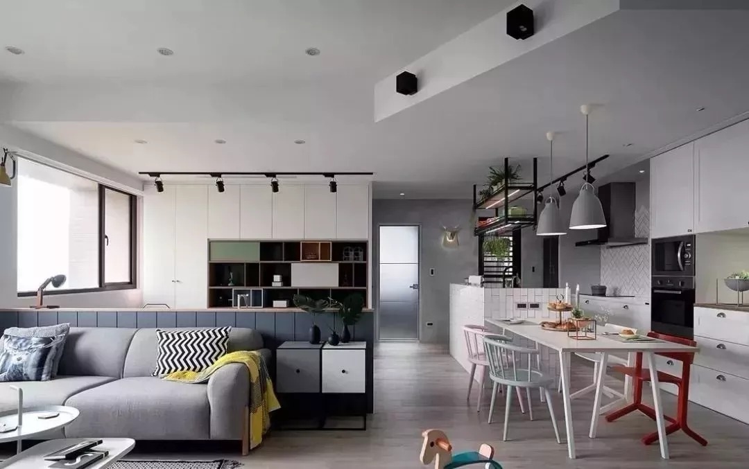 而這些年最 Fashion 的空間布局,莫過(guò)于客餐廚一體化了。有些甚至將書房、辦公區(qū)乃至游樂(lè)區(qū)納入其中,最大程度地讓視線得到延展,增強(qiáng)家庭交流,乍一看仿佛住在了大別墅里。