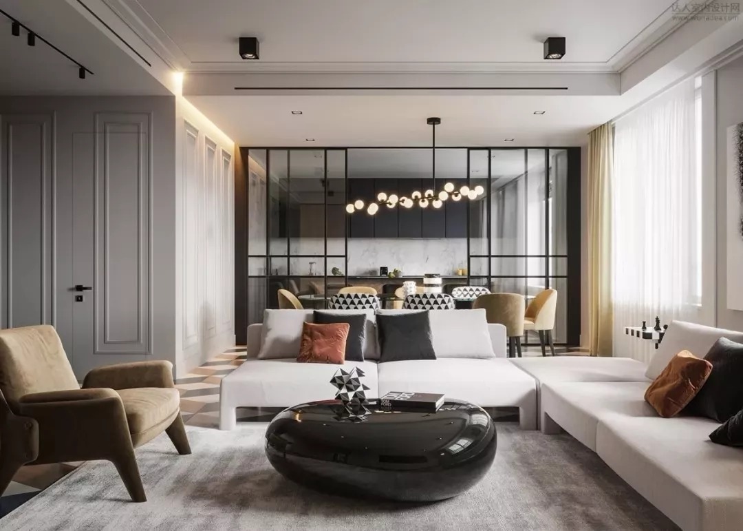 空間的隔斷也舍棄了原來(lái)的柜體、墻體等形式,以更加通透性的玻璃隔斷為主,能夠帶給人更強(qiáng)的視覺沖擊力。局部使用也能豐富空間的層次感,為客廳帶來(lái)一些靈動(dòng)和多變性。