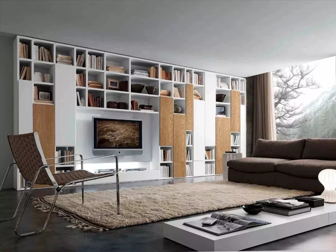 一般來(lái)說(shuō),整面墻的書柜可以與電視合二為一,也可以安置于沙發(fā)背后的墻面。它不僅具有延伸視線的功能,還能起到不錯(cuò)的收納與裝飾效果。