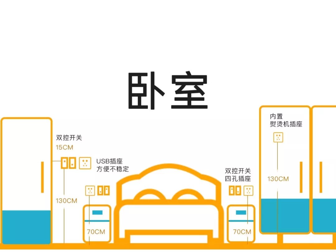 2、床頭插座:床頭兩邊各安裝1個(gè)帶USB的五孔插座,高度和地面相距70cm,方便手機(jī)和床頭燈充電使用;