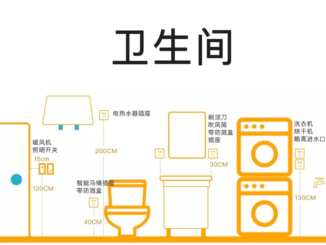 1、馬桶:馬桶處安裝帶防濺水蓋的五孔插座,以備日后更換智能馬桶使用,高度和地面相距40cm;