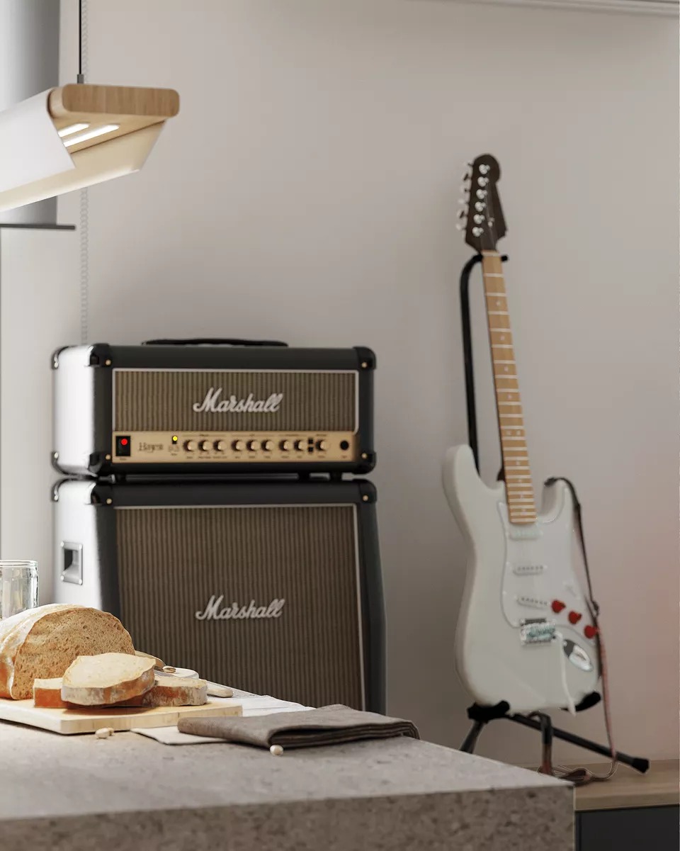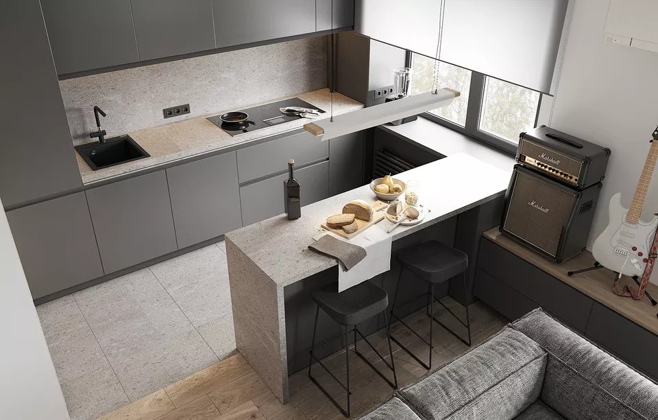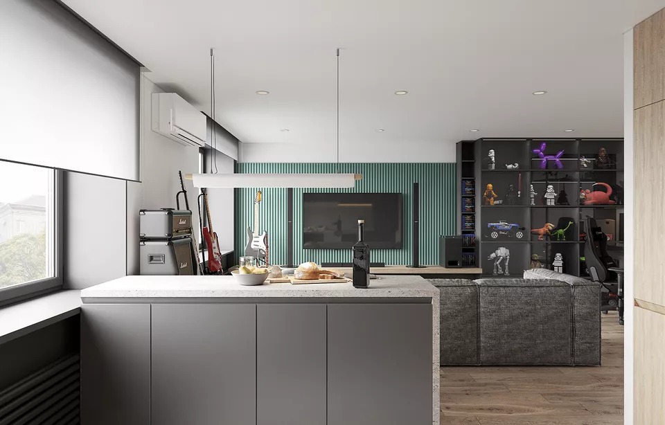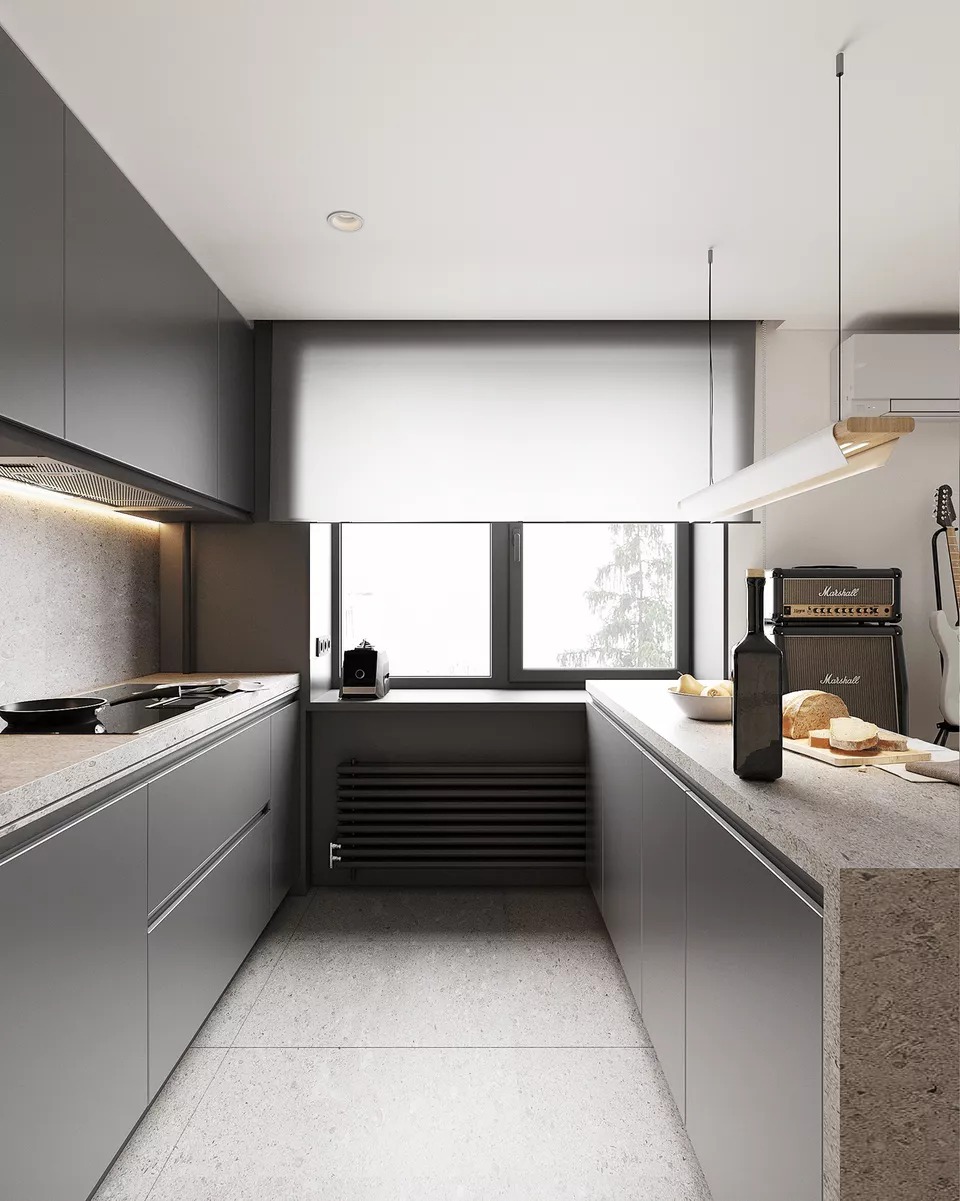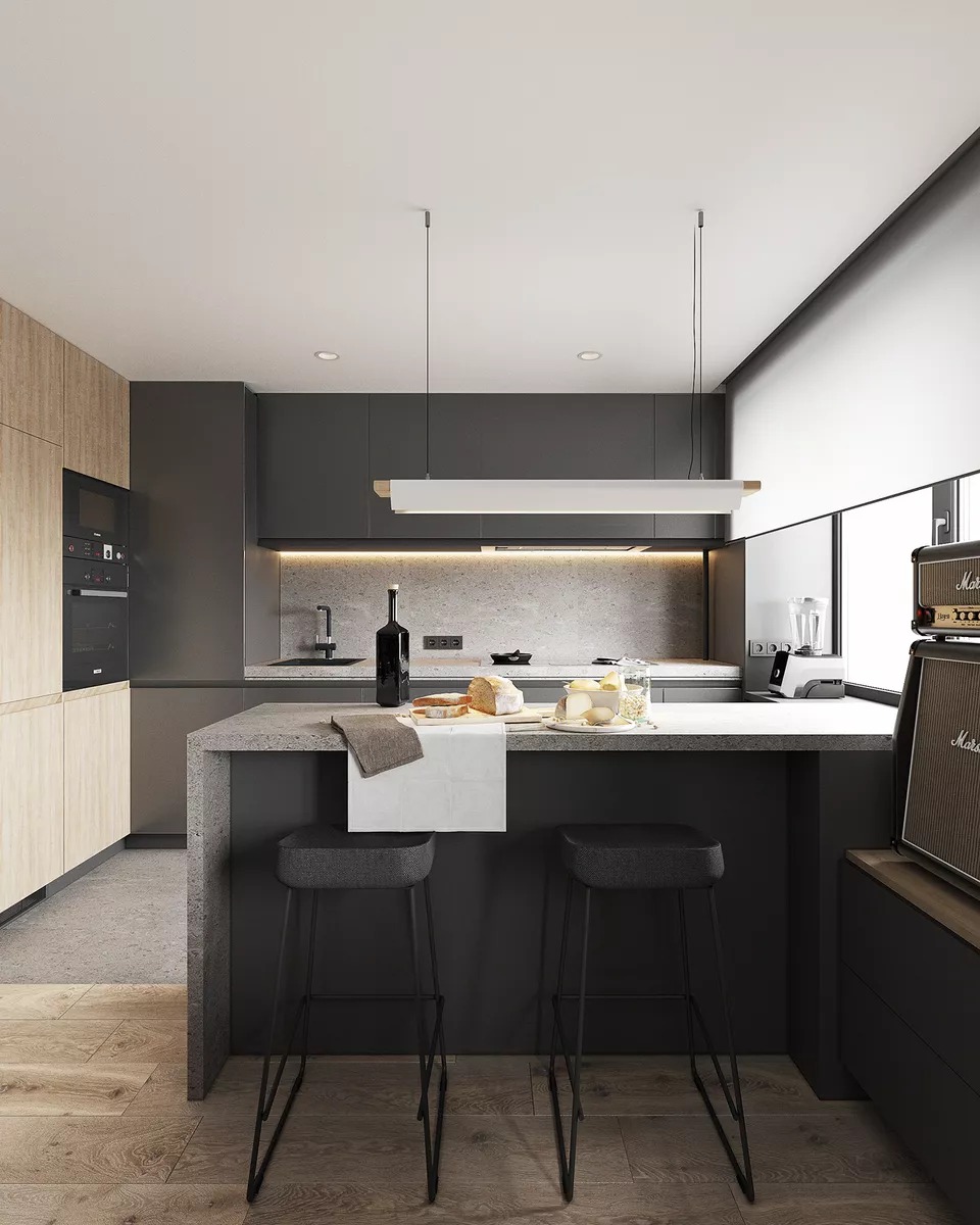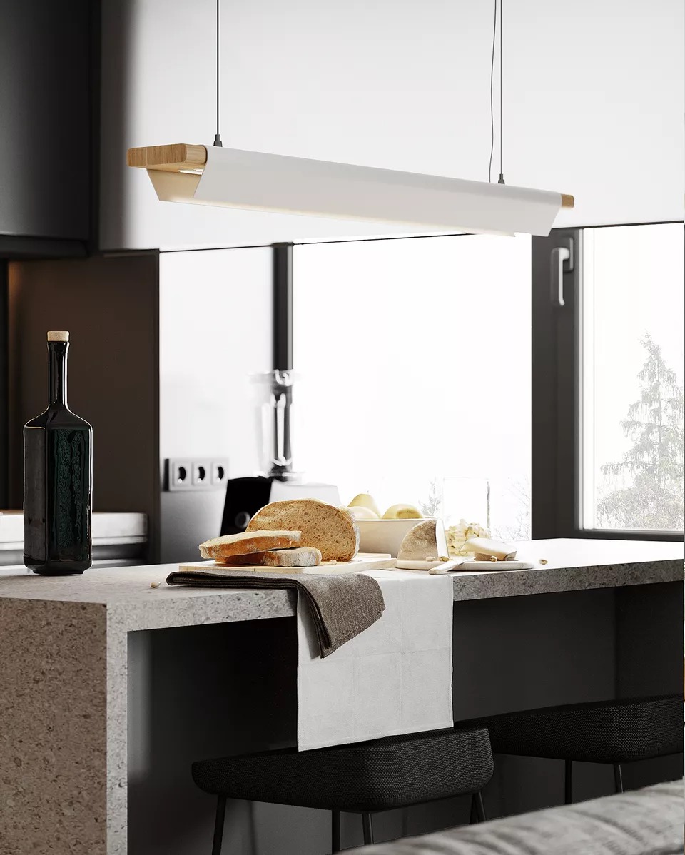 搭配白色臺面、原木柜,深淺搭配,色調(diào)互補。