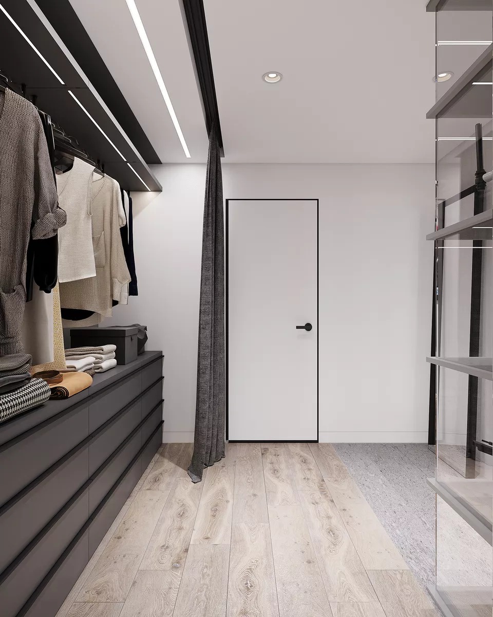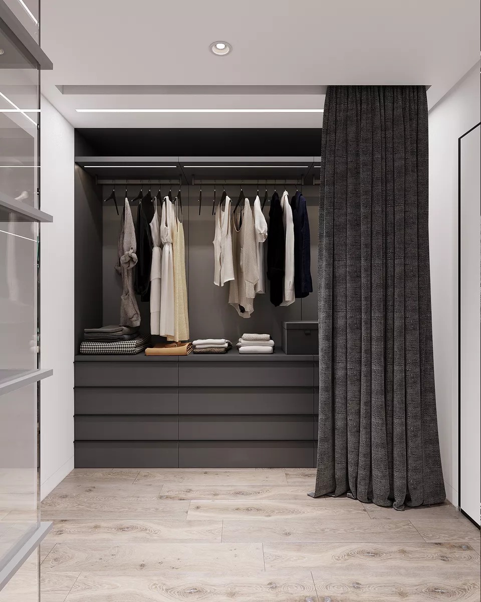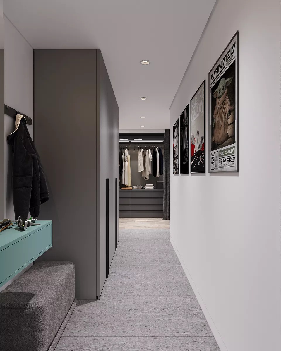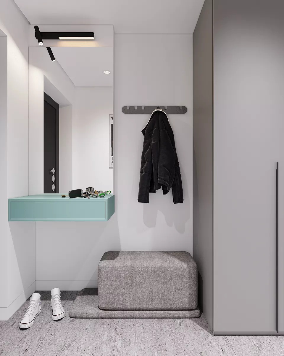 進門坐凳簡潔、舒適,所有收納移交至右側(cè)衣柜,鞋、包包、配件等都可放里面。