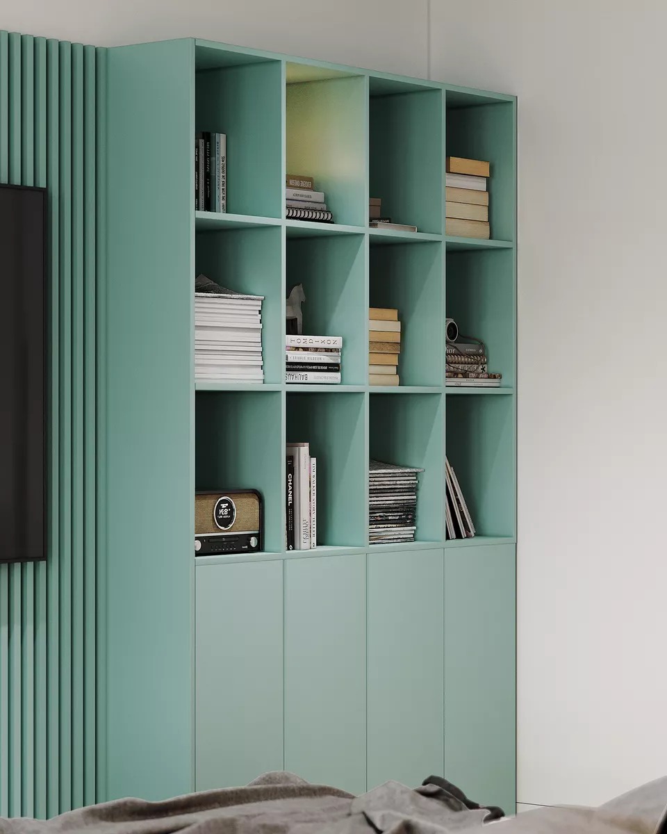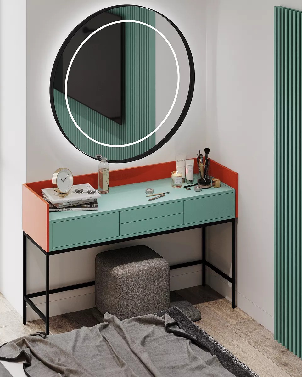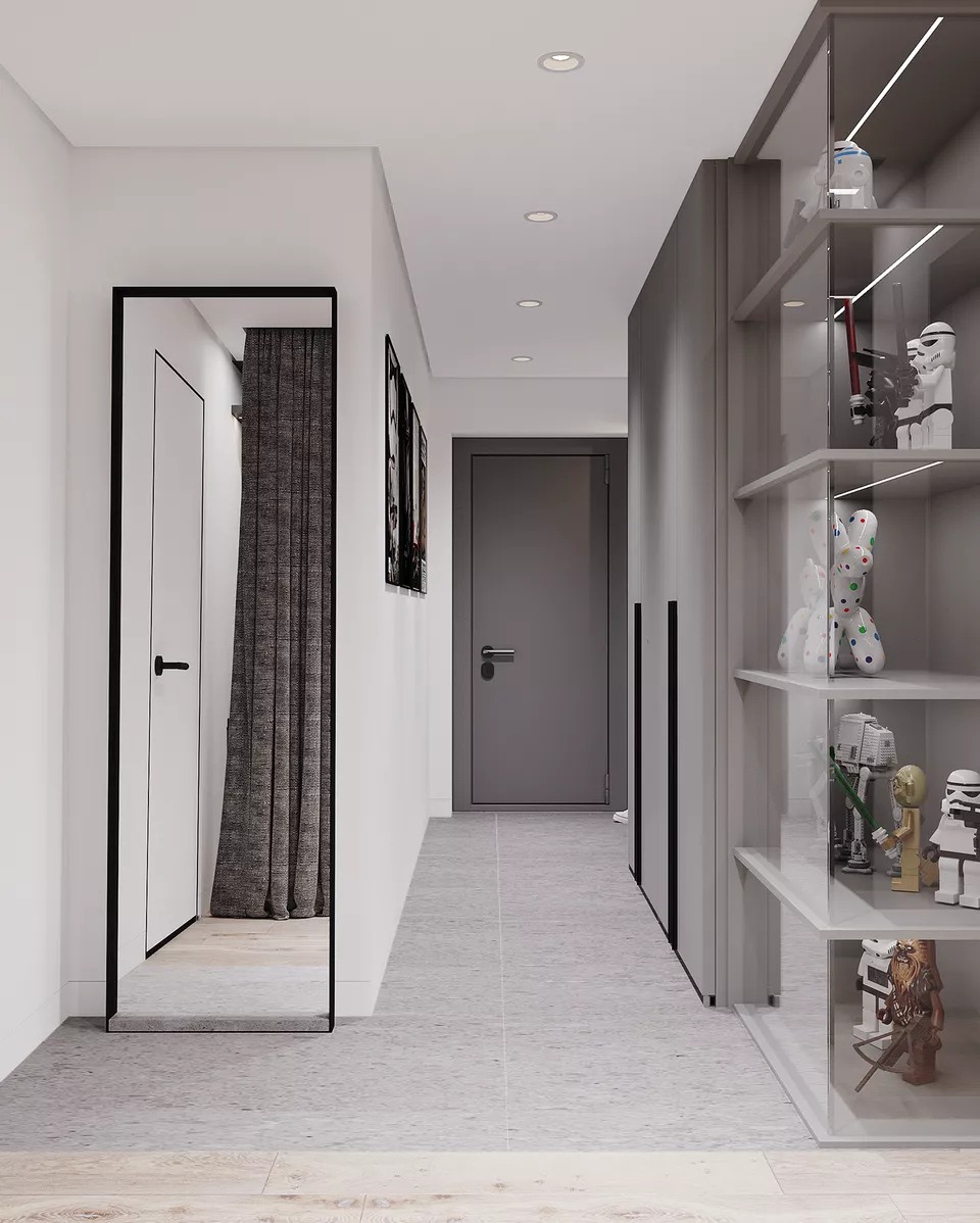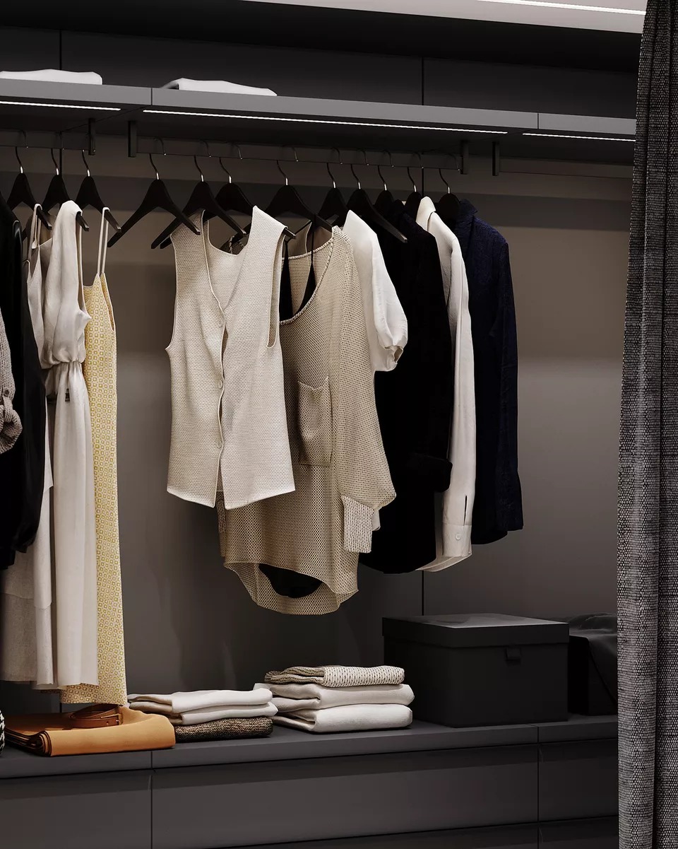 進門坐凳簡潔、舒適,所有收納移交至右側(cè)衣柜,鞋、包包、配件等都可放里面。