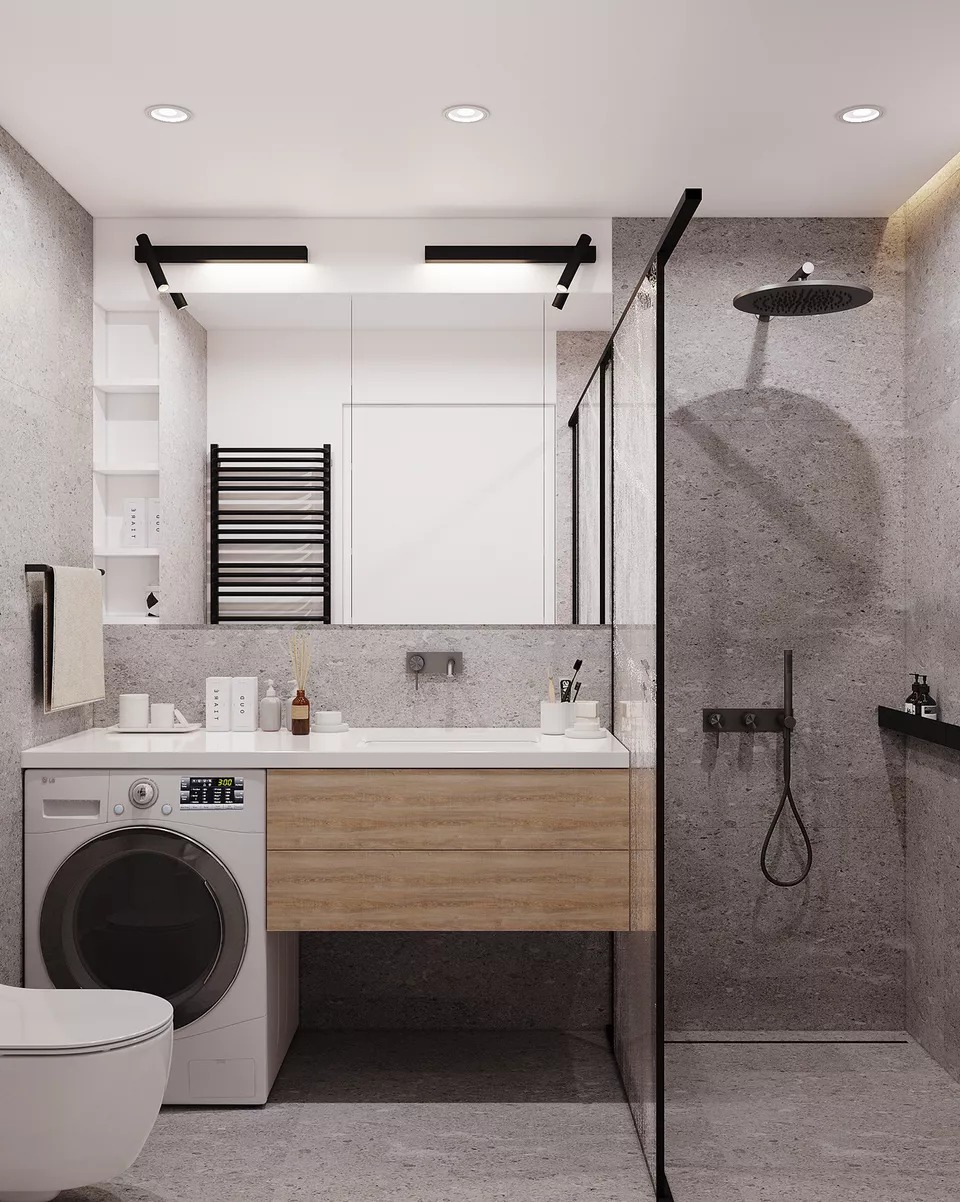 衛(wèi)生間以大面積的磨砂灰為背景,
