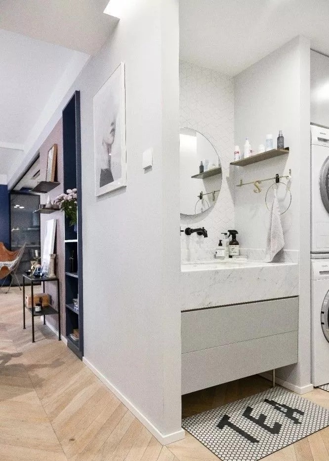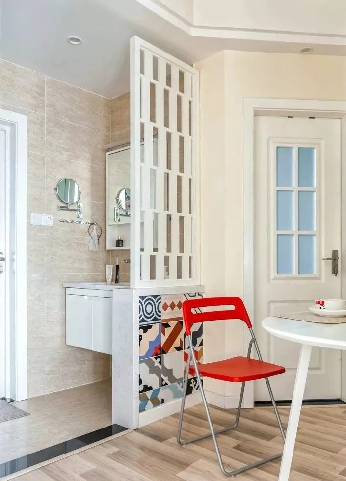 另外還可以把洗手臺(tái)當(dāng)做玄關(guān)隔斷來使用,同時(shí)臺(tái)面上下還能增設(shè)收納空間,