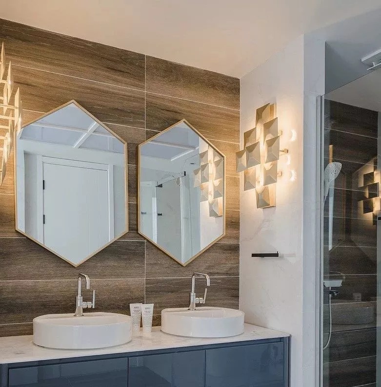 光線對(duì)于照鏡子來說是頭等需求,多數(shù)人可能只會(huì)在鏡子上方安裝一個(gè)鏡前燈,其實(shí)超好的方式是,鏡子左右兩側(cè)設(shè)置燈光,大概一人寬的距離,很多專業(yè)的化妝臺(tái)都是這樣設(shè)置的。