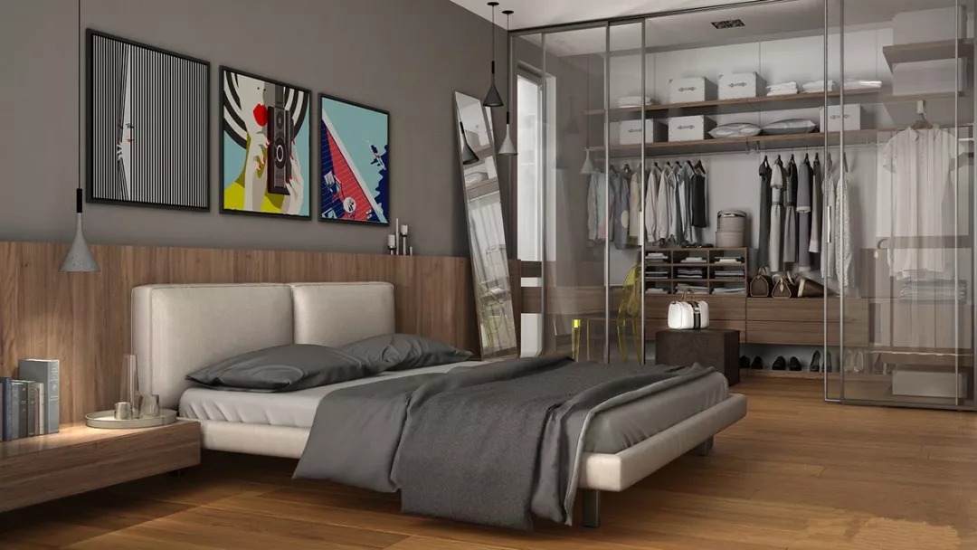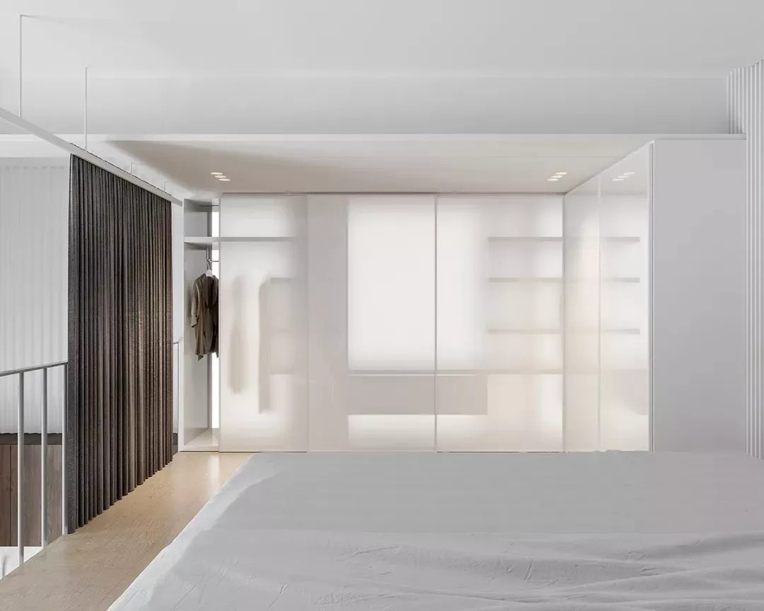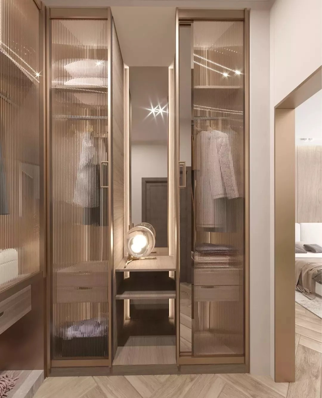 不想犧牲空間的通透感,可以把衣帽間的門改成玻璃或格柵,讓臥室看起來更敞亮。