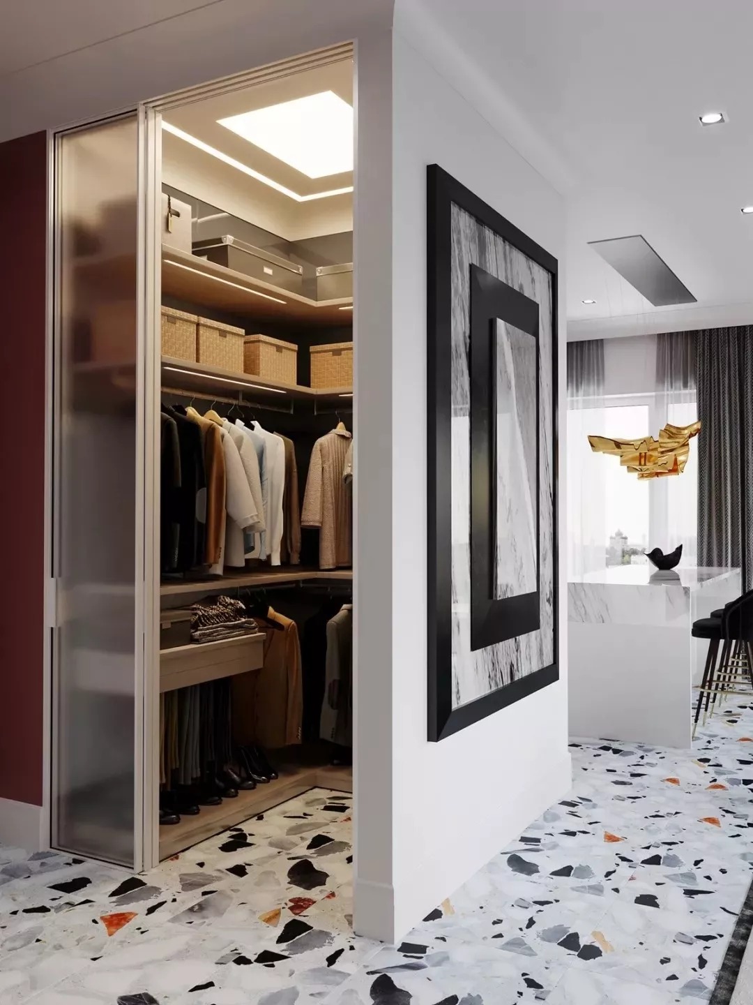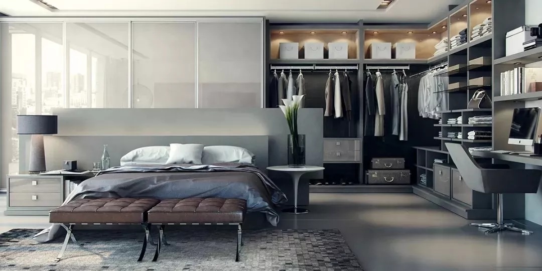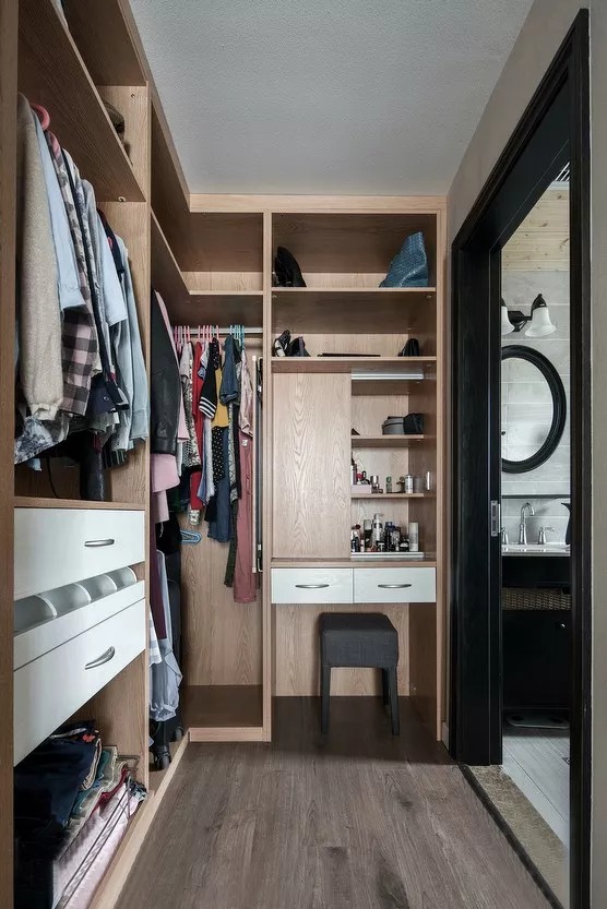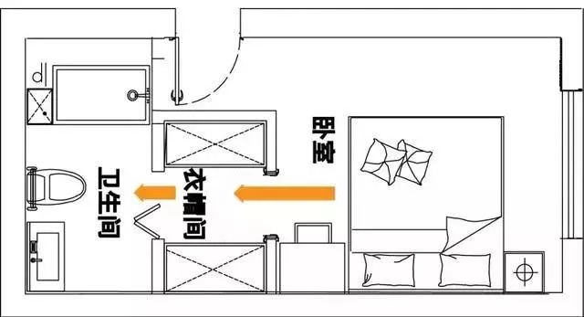最常見的是,衣帽間與衛(wèi)生間共用同一個(gè)入口,早晨起來從臥室到衣帽間換衣服再到衛(wèi)生間洗漱,一氣呵成。