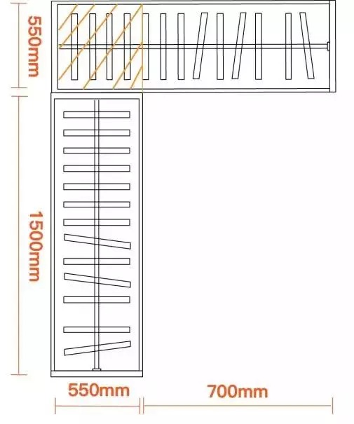小型衣帽間形狀一般以L型和二字型為主,如果L型和二字型,兩邊都放550mm進(jìn)深,長1500mm的柜子,算下來,L型布局需要2.56㎡,二字型需要2.7㎡。大家可以根據(jù)衣帽間的形狀自行