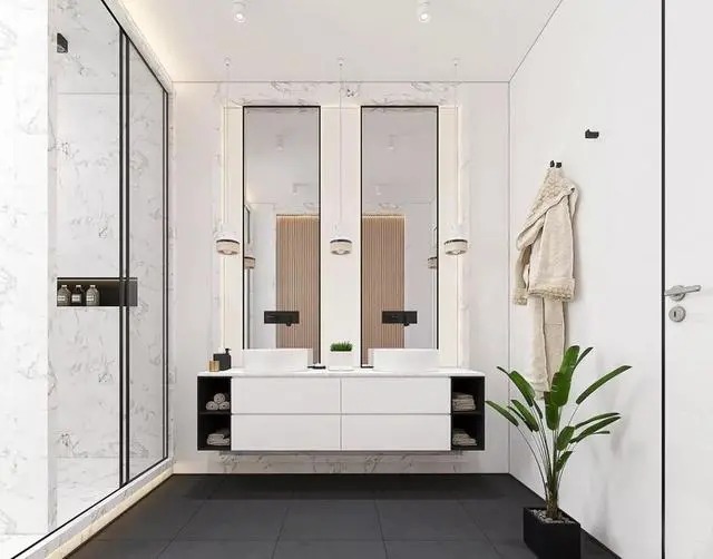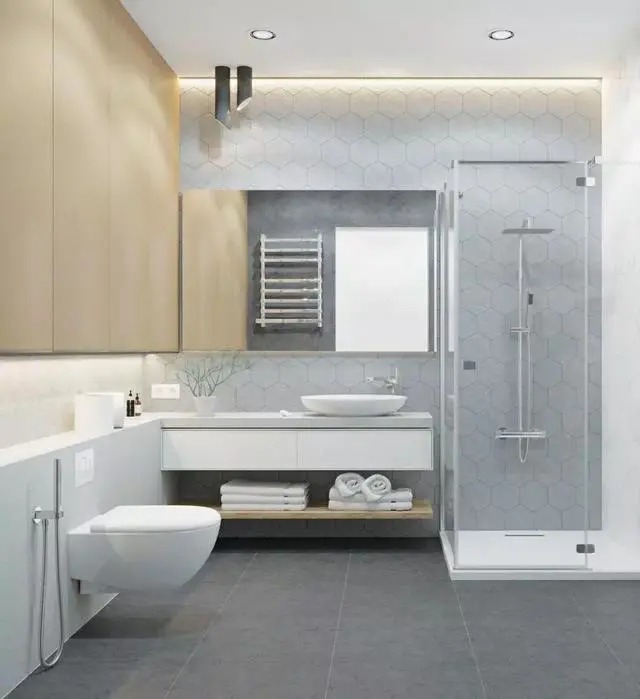19、衛(wèi)生間的水電管線位置盡量高一點(diǎn),也可以要求貼磚和吊頂都做高,會(huì)讓衛(wèi)生間顯得大很多。